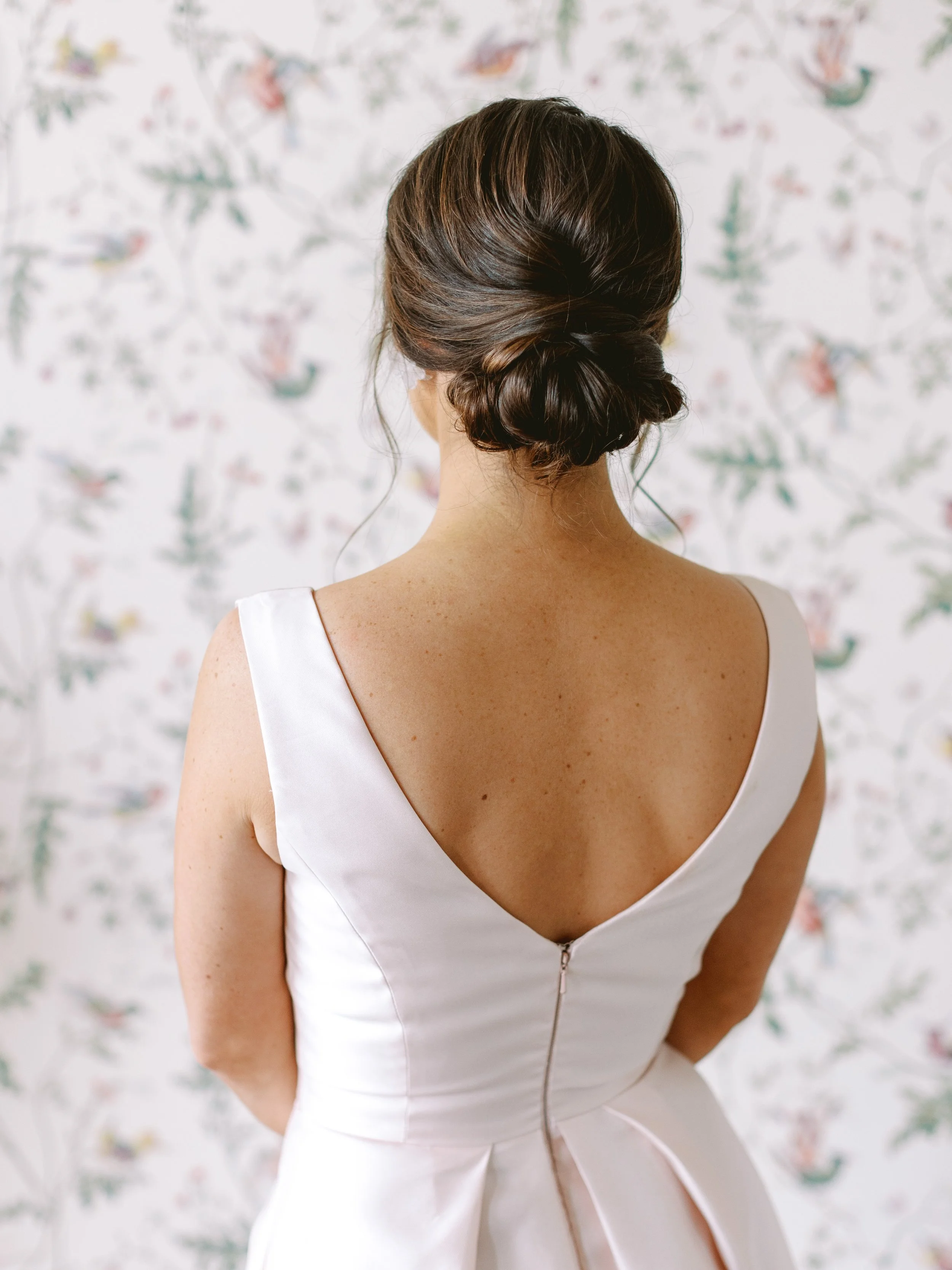 Back view of a woman in a white dress with her hair styled in an elegant updo, standing in front of a floral wallpaper.