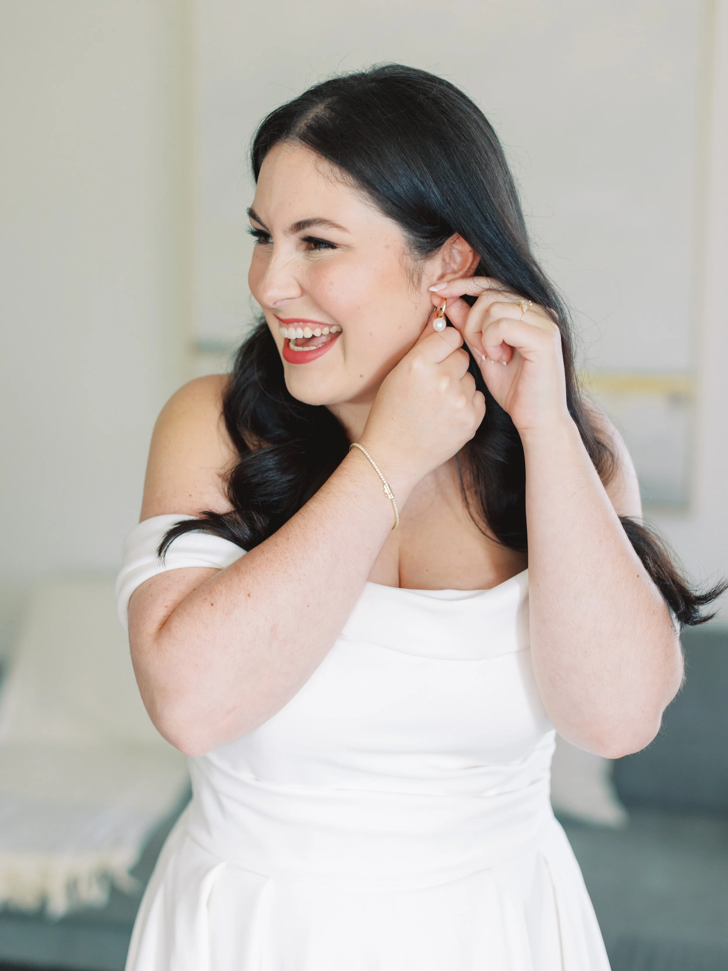 A woman with long dark hair smiling and putting in earrings, wearing a white off-shoulder dress.