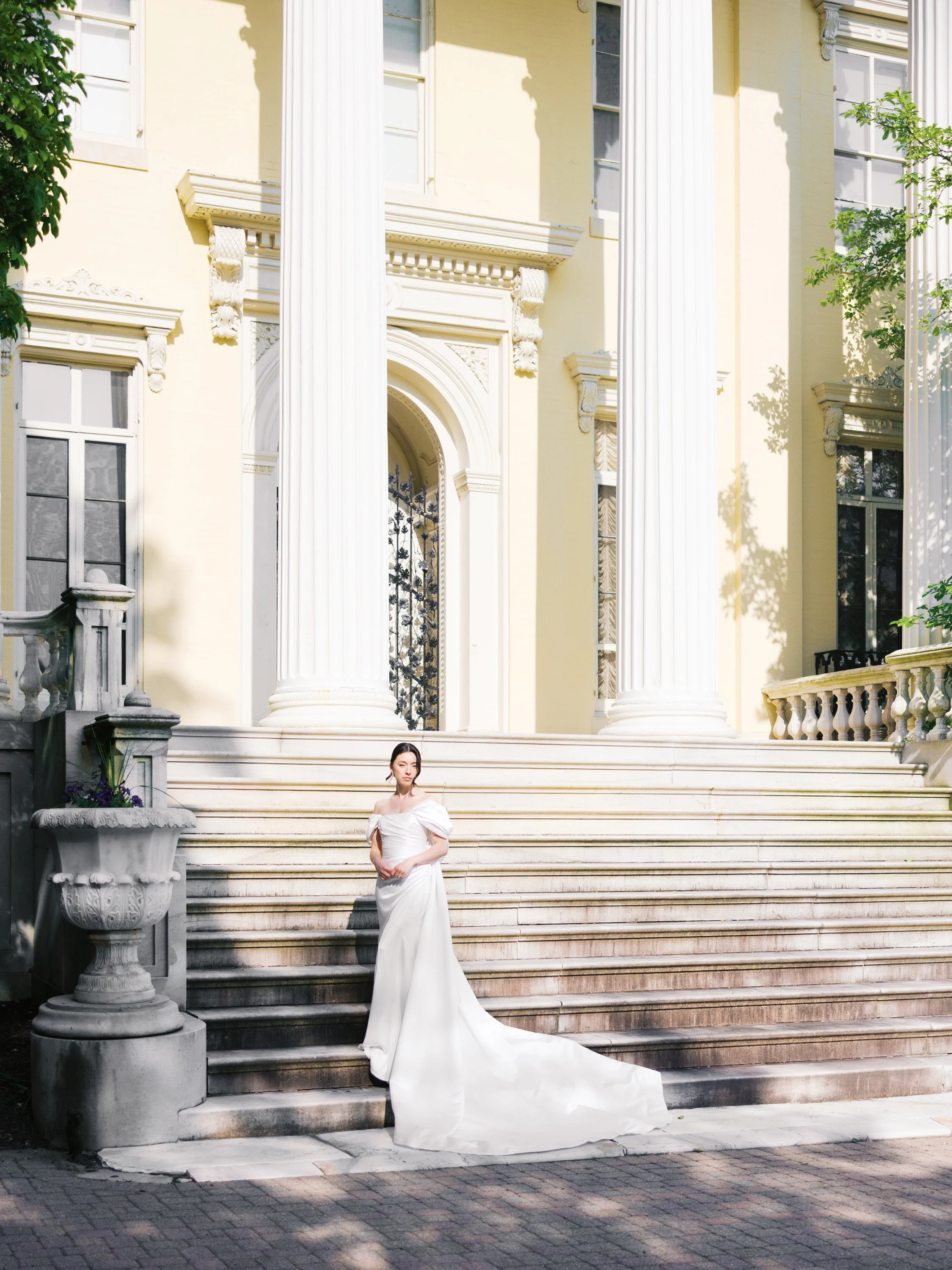 A woman in a white wedding dress standing on the steps of a grand, neoclassical building with tall columns and ornate architectural details.