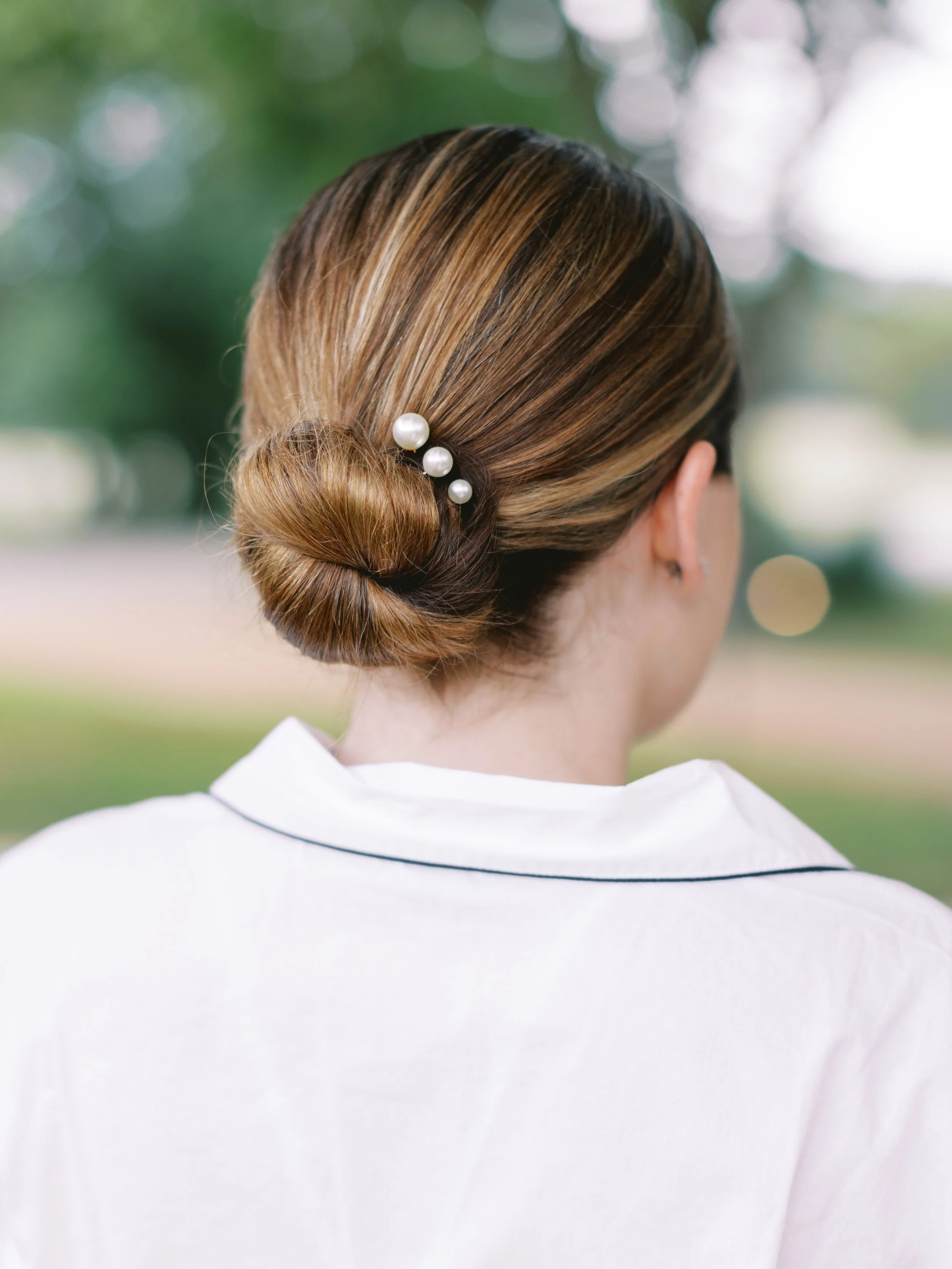 Back view of a woman with brown hair styled in a low bun adorned with pearl hairpins, wearing a white shirt with a black piping collar, outdoors with blurred green trees in the background.