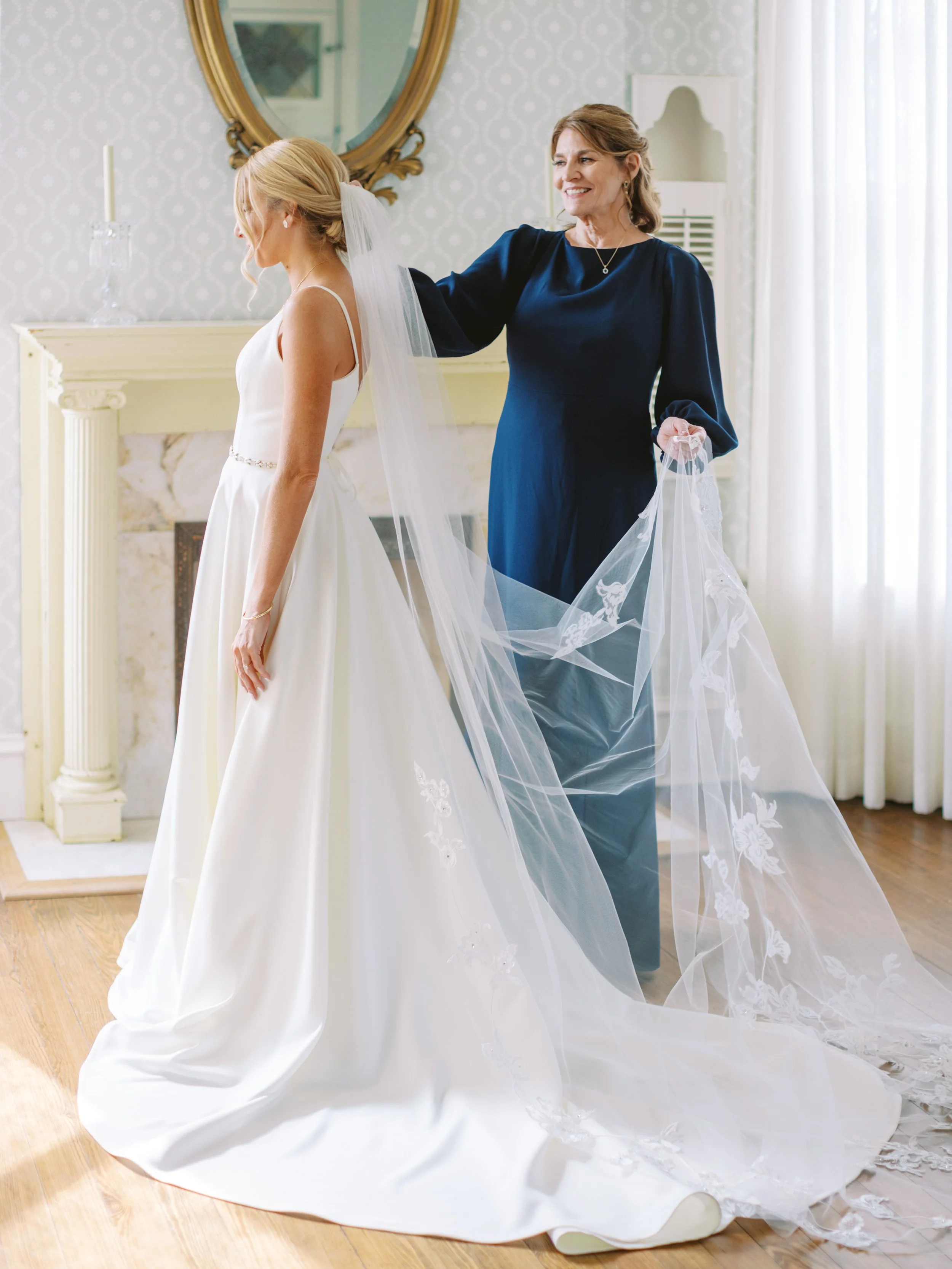 A bride in a white wedding dress with a veil standing in a room with a woman in a blue dress holding her veil. The room has a wreath mirror above a fireplace and light-colored wallpaper.