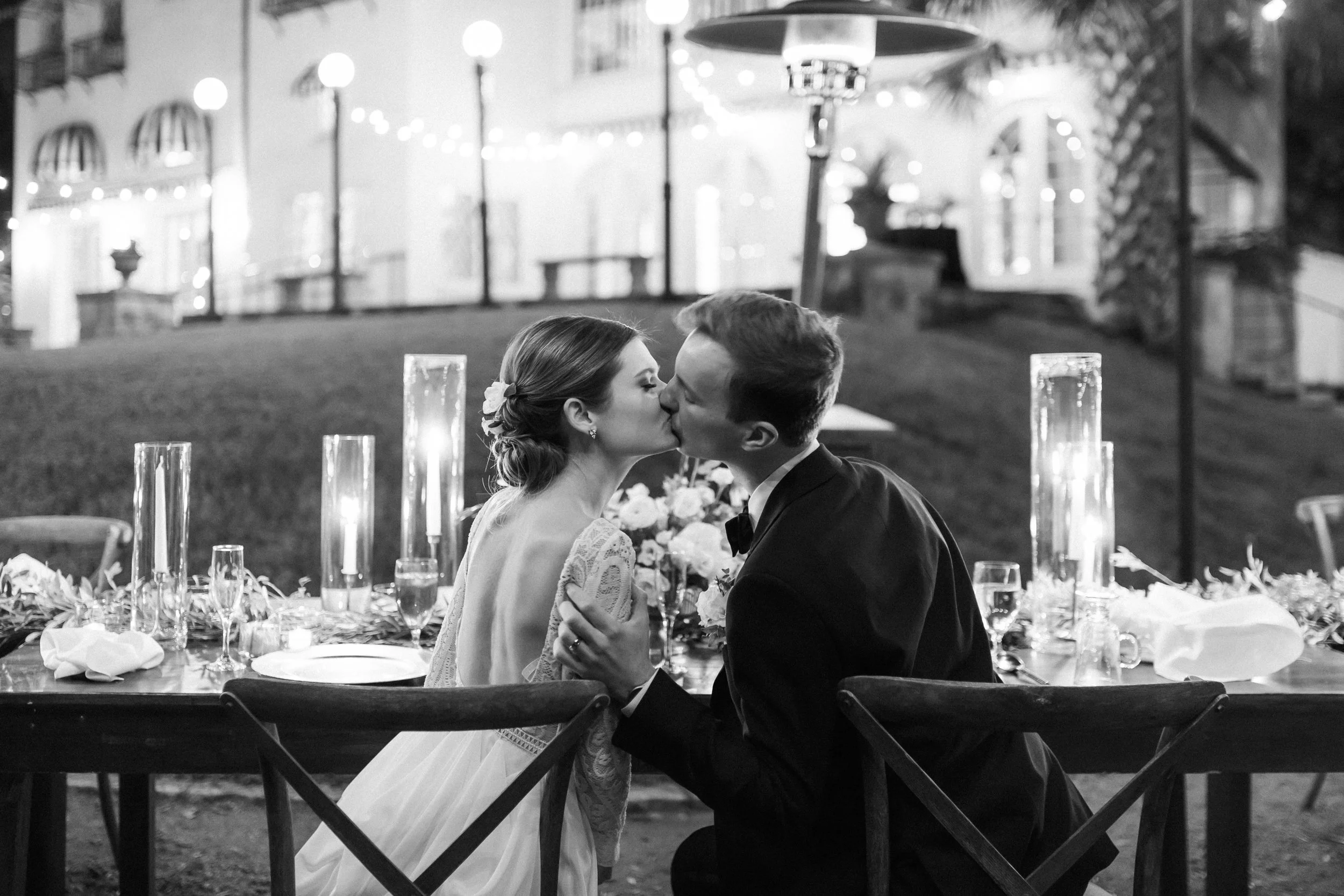 A couple in wedding attire sharing a kiss at a decorated outdoor wedding reception table during the evening.
