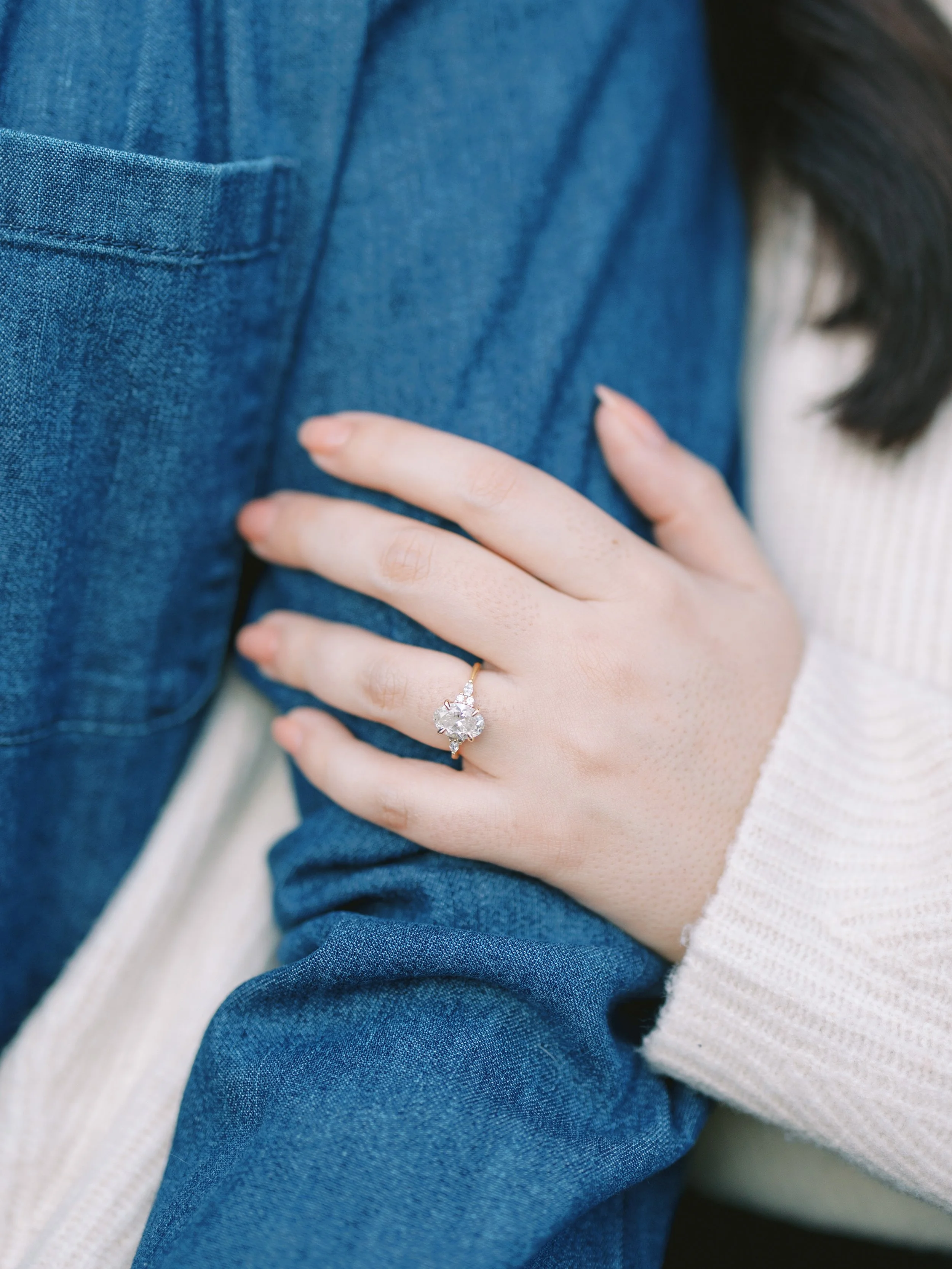 Close-up of a woman wearing a white sweater showing her hand with a large diamond engagement ring resting on a man's chest, who is wearing a blue denim shirt.