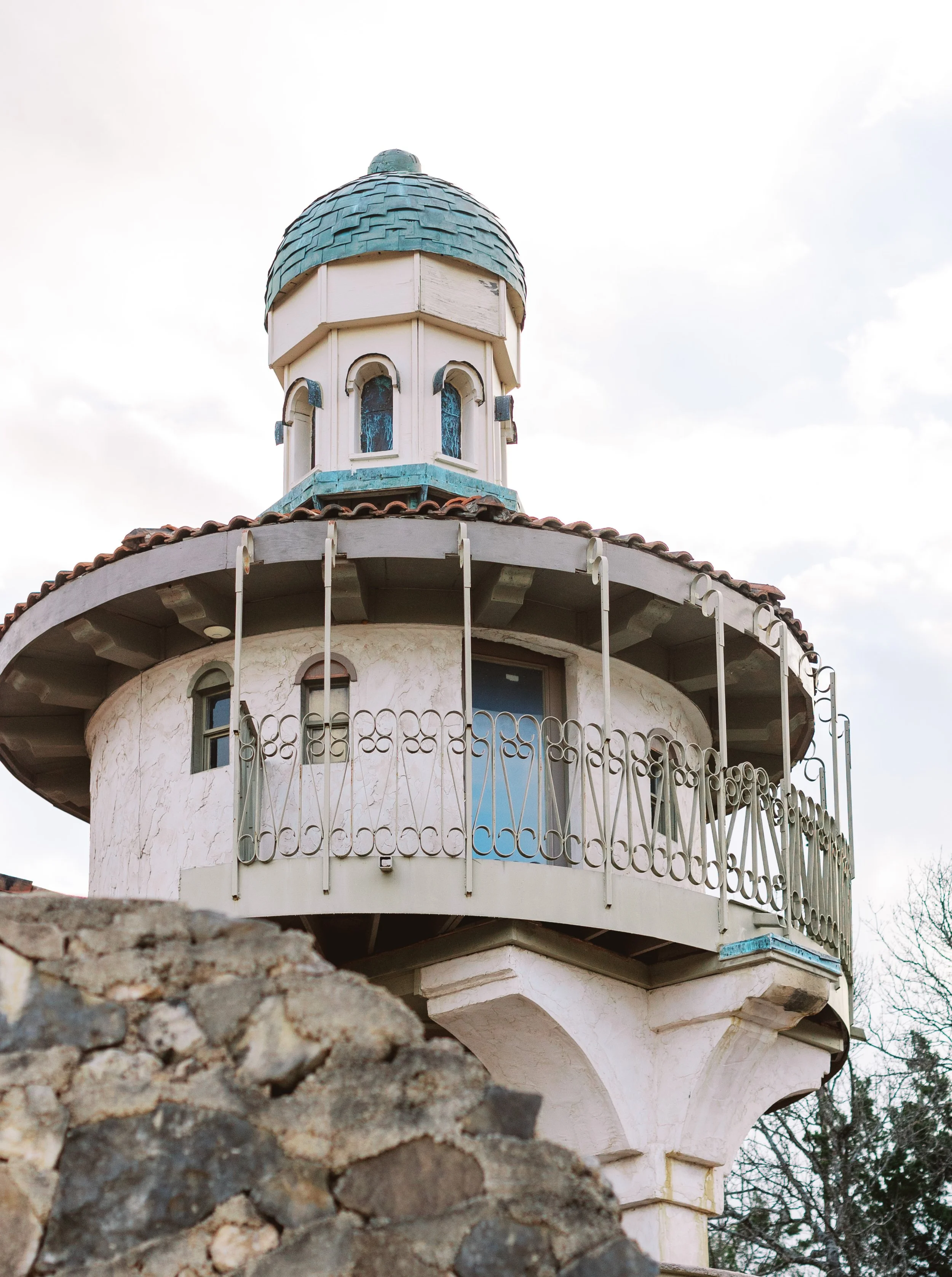 Close-up of a small, round, white tower with a blue-tiled, dome-shaped roof and a decorative railing around a balcony, set against a cloudy sky.