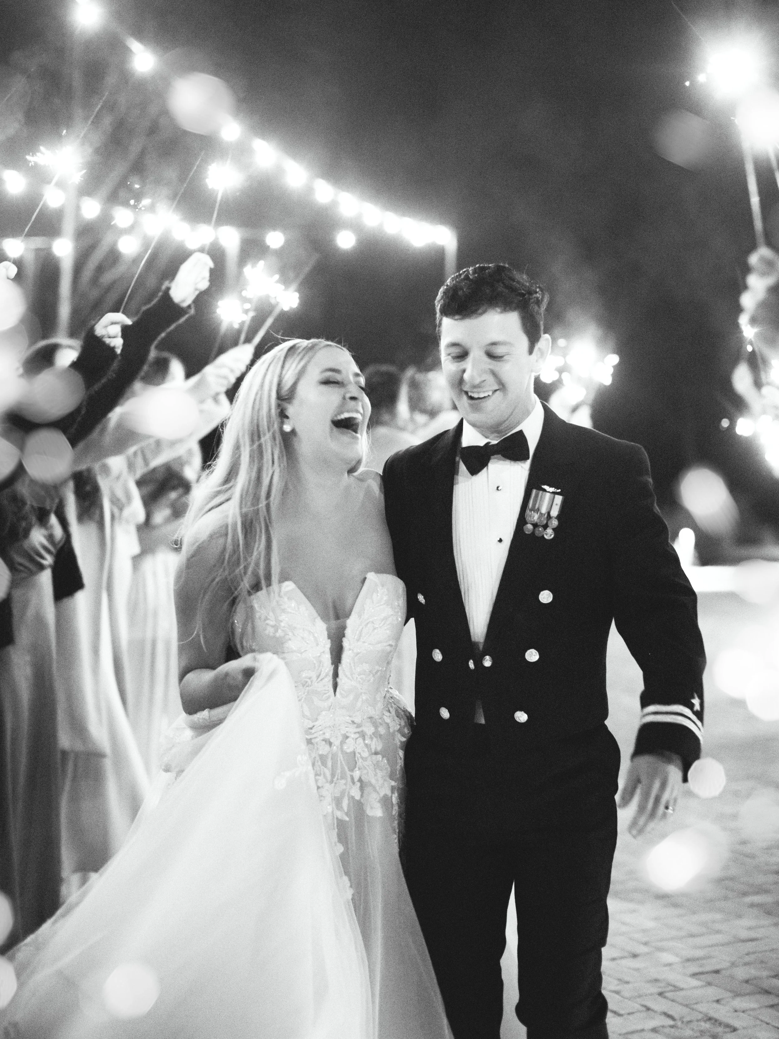 A black-and-white photo of a bride and groom smiling and laughing at their wedding reception, surrounded by guests holding sparklers.