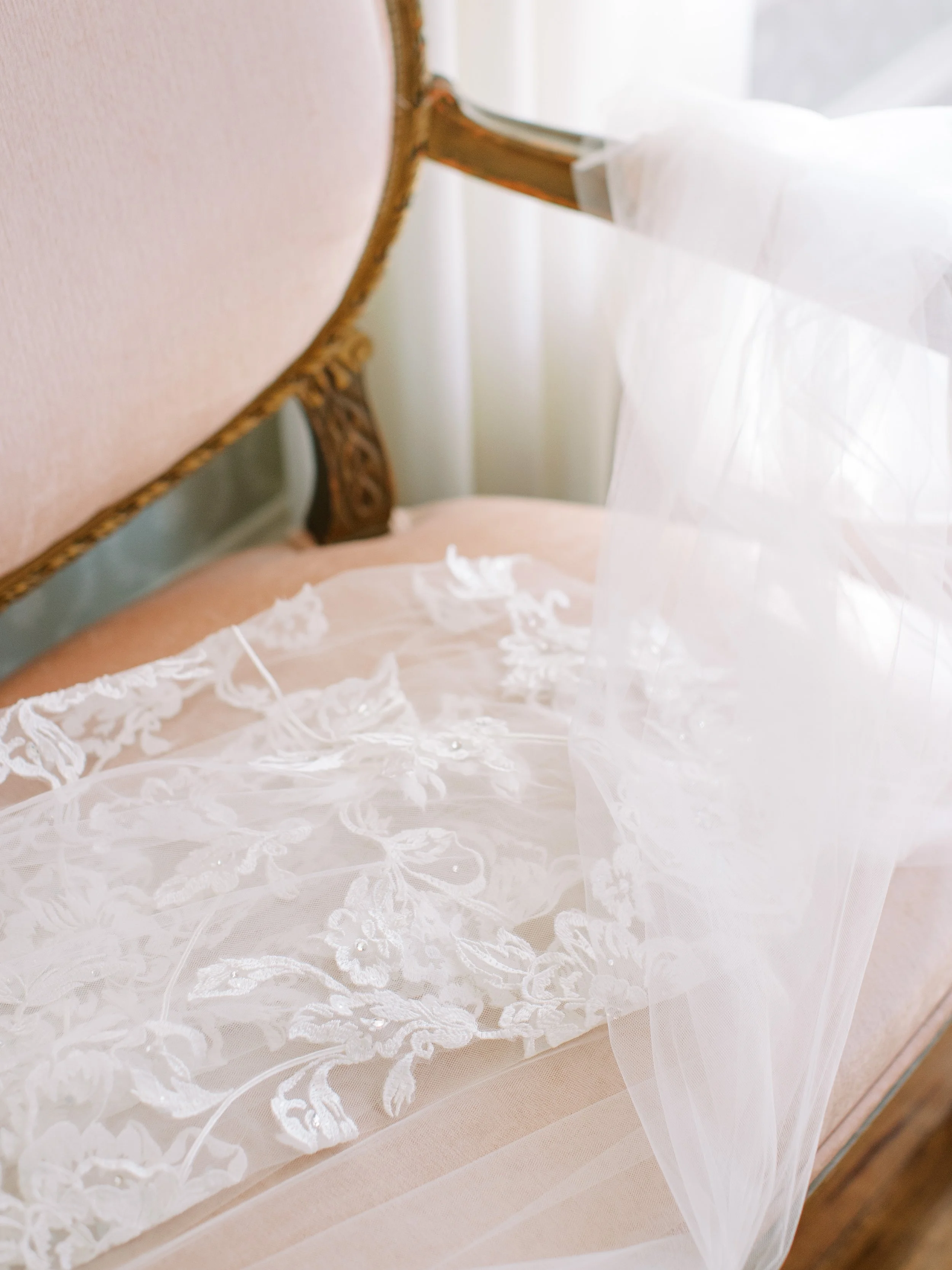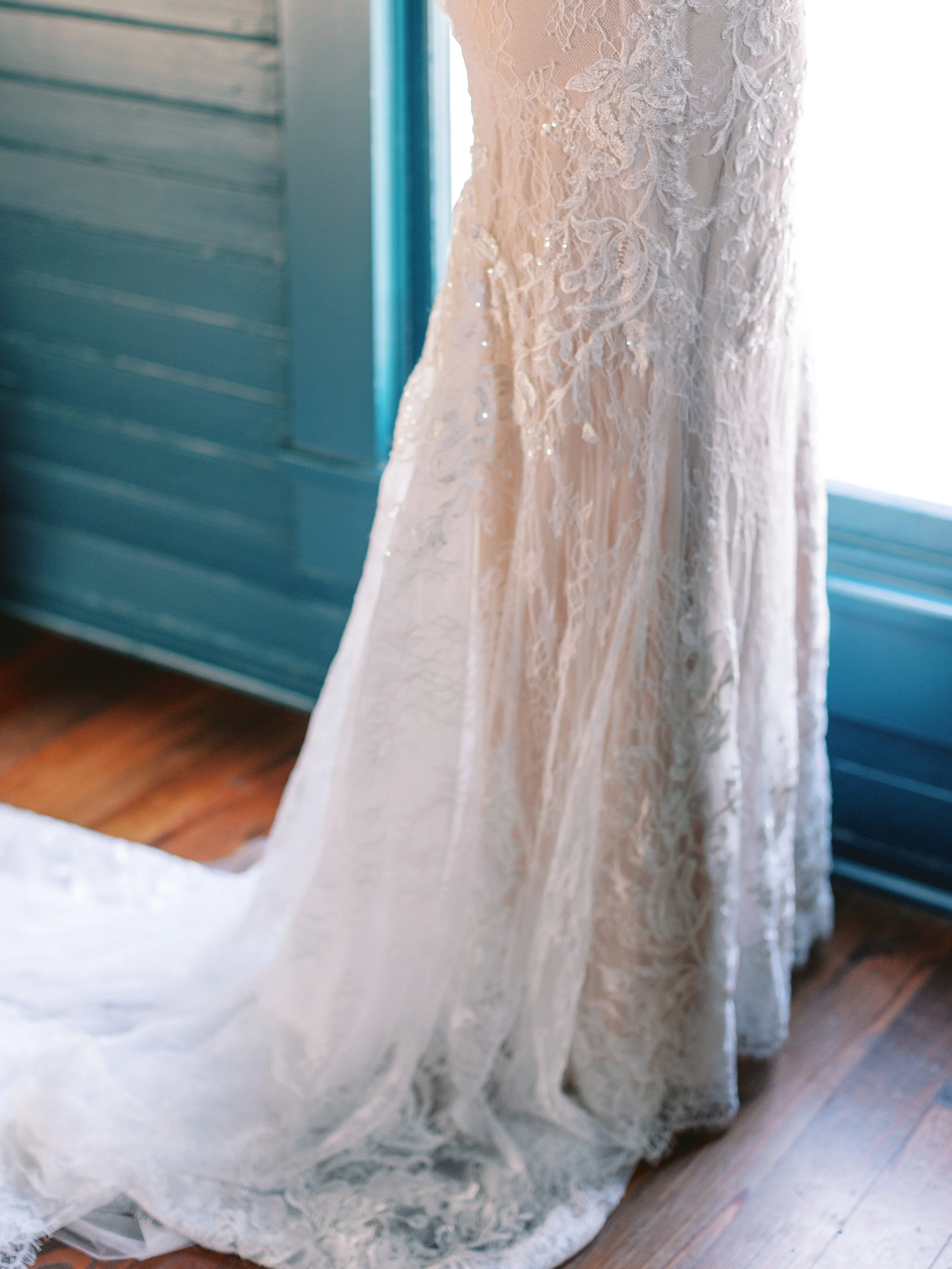 Close-up of an elegant lace wedding dress hanging by a window with sunlight streaming through.