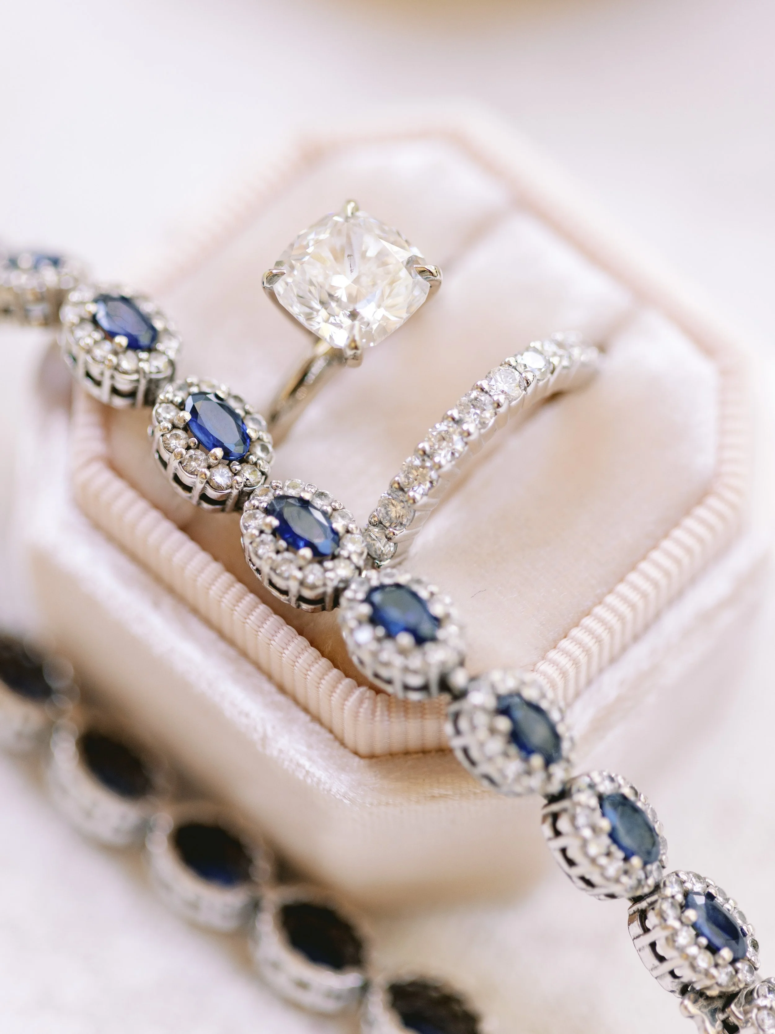 Close-up of a jewelry box with a large diamond ring and a pearl ring with blue stones, surrounded by a matching bracelet and earrings with blue stones and diamonds.