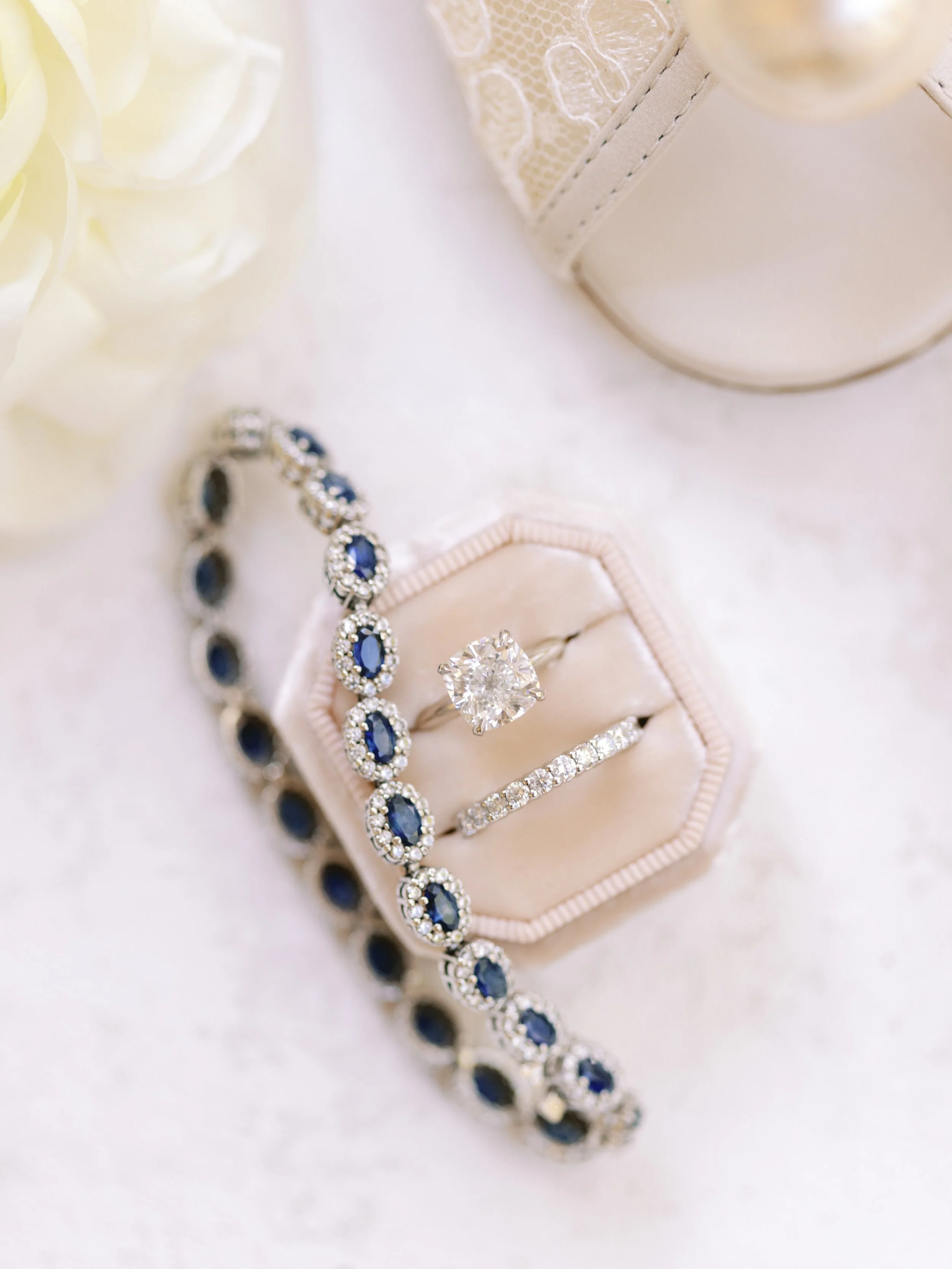 A diamond engagement ring and a diamond wedding band in a pink jewelry box, alongside a blue gemstone bracelet with diamonds, all set on a white surface with a white decorative flower and a white candle.