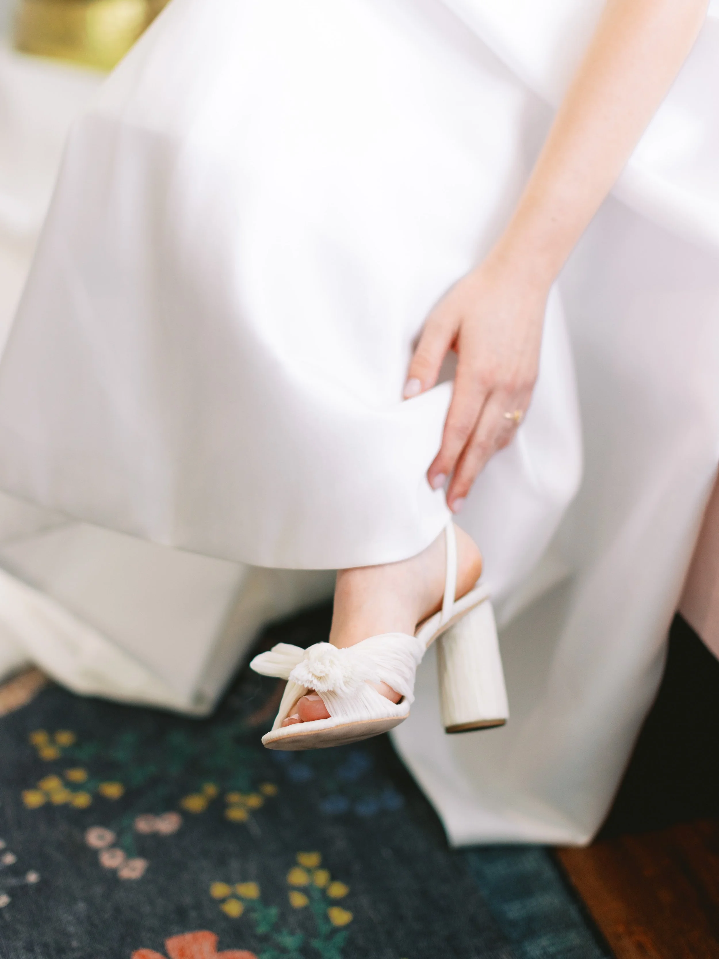 Close-up of a woman adjusting her white high-heeled sandal with a bow, while wearing a white dress.