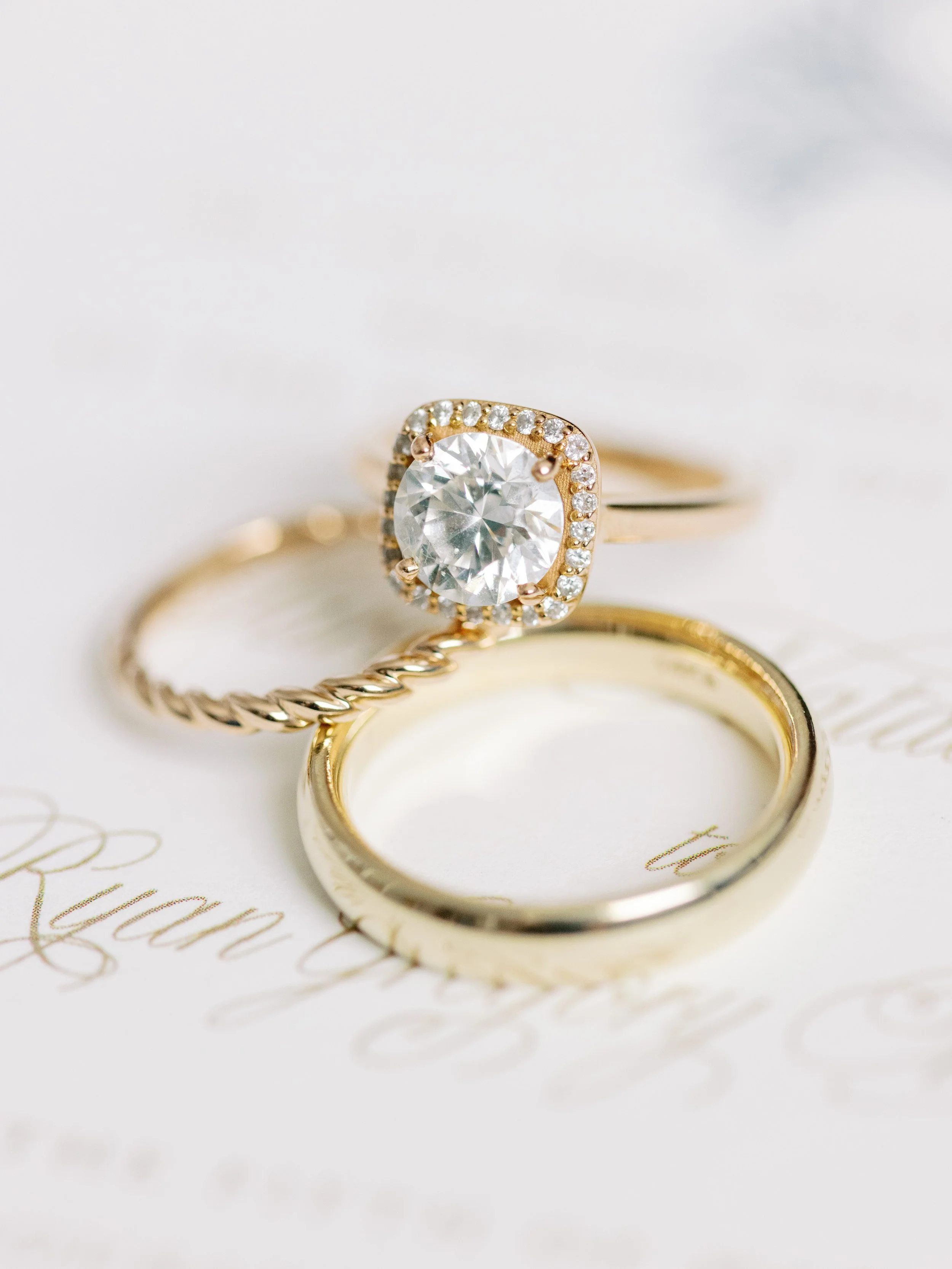 Close-up of three gold rings on a white velvet ring box, including an engagement ring with a large diamond, a wedding band with small diamonds, and a plain gold band.