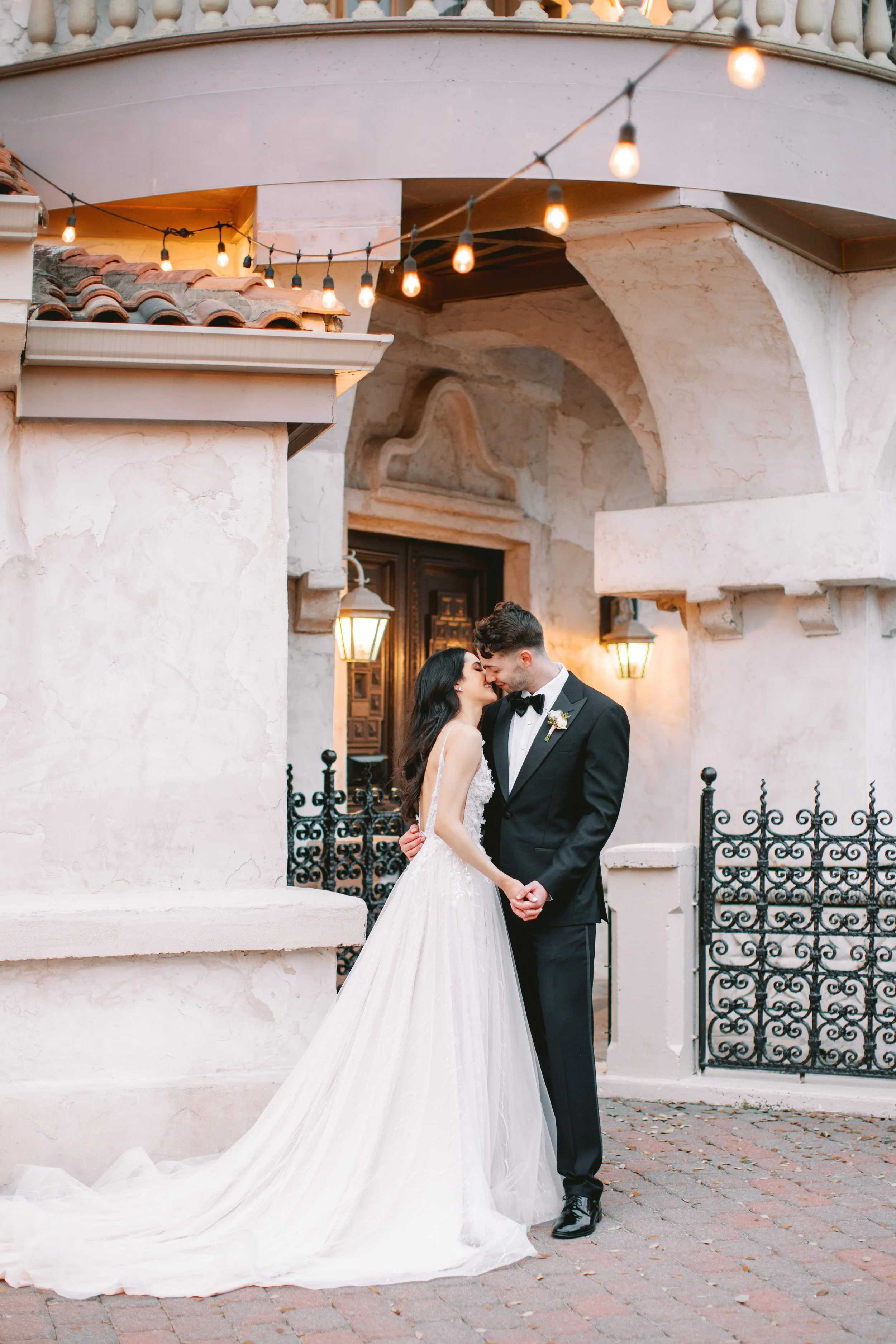 Bride and groom standing under an archway, holding hands. The bride is wearing a long lace wedding gown with a train and veil, and the groom is in a black tuxedo with a bow tie, holding a bouquet of flowers.