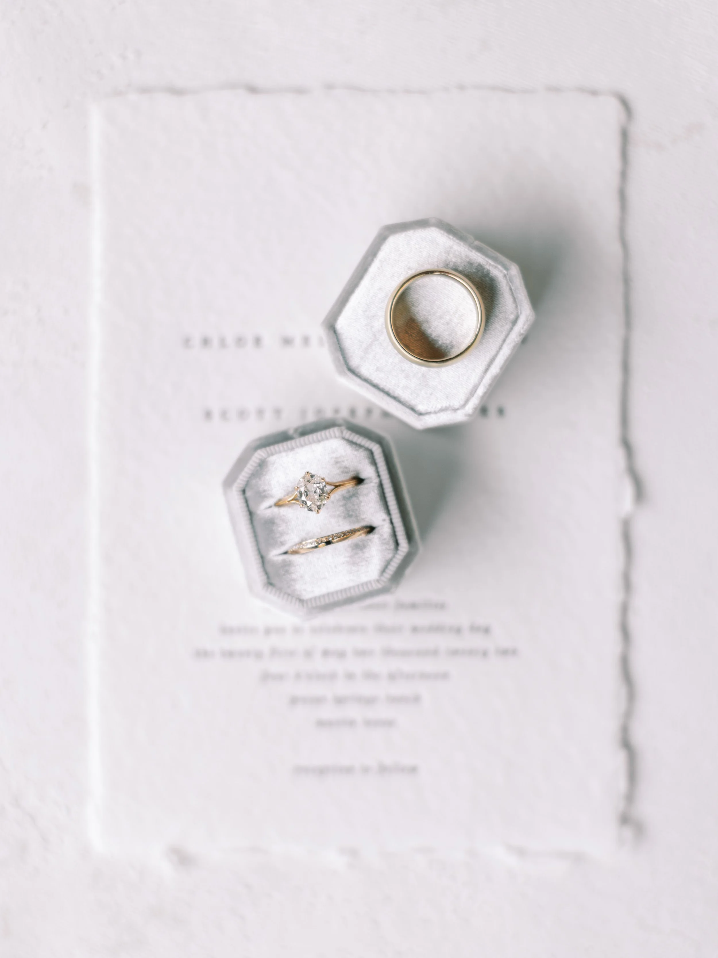 A close-up of a jewelry box with wedding rings and an engagement ring inside, placed on a white textured background with partially blurred text.