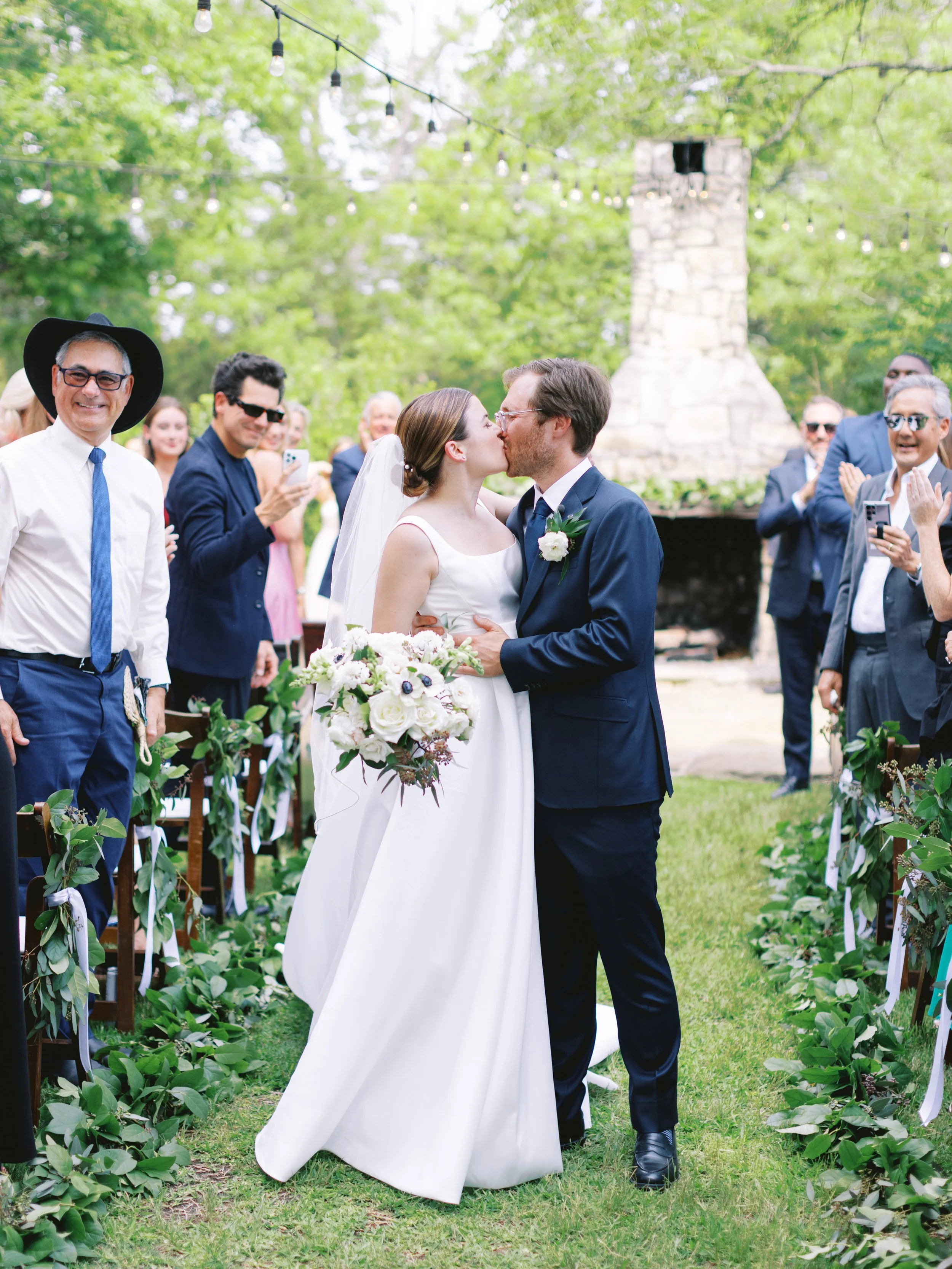 A bride and groom share a kiss during their outdoor wedding ceremony, surrounded by friends and family, with green trees and string lights overhead.