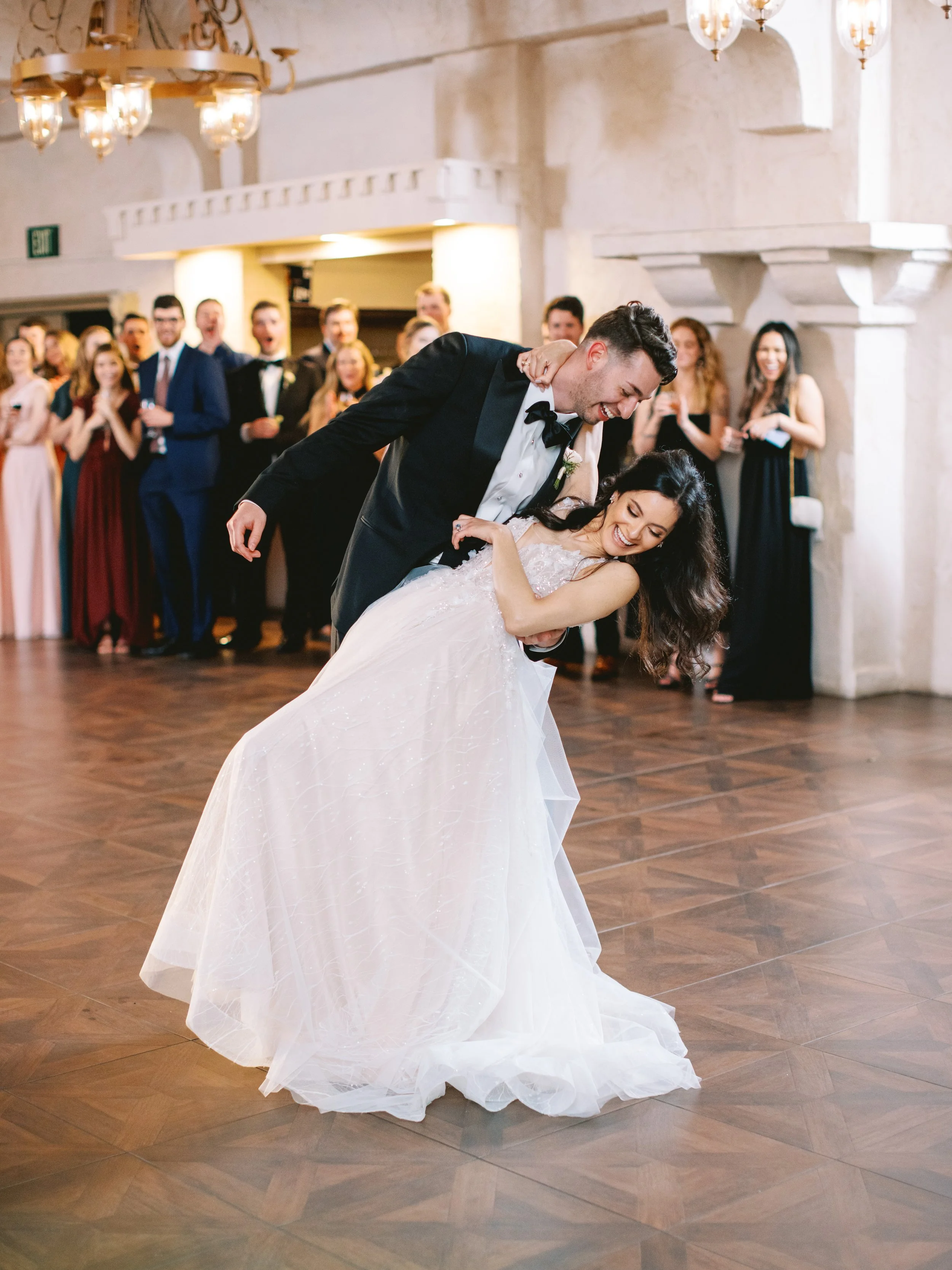 Bride and groom dancing at a wedding reception with guests watching and smiling in the background.