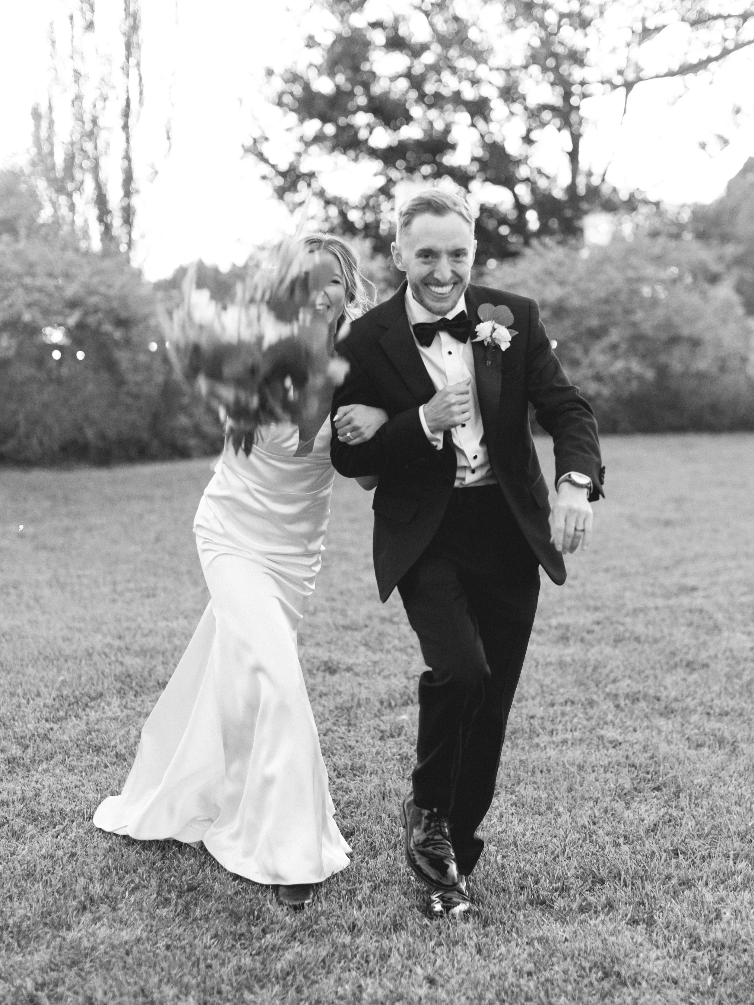 A newlywed couple, the bride in a white wedding dress and the groom in a tuxedo, running on a grassy field with trees in the background, smiling and holding hands, celebrating their wedding.