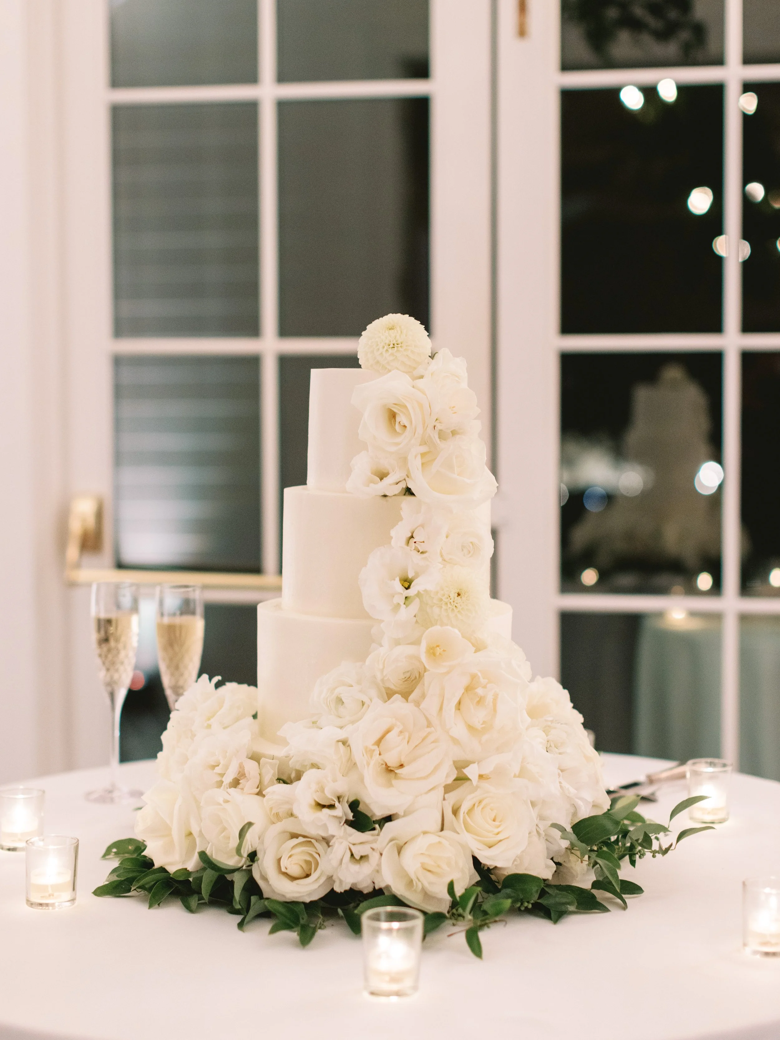 A tall, white wedding cake with floral decorations sits on a round table surrounded by small votive candles, with a window in the background.