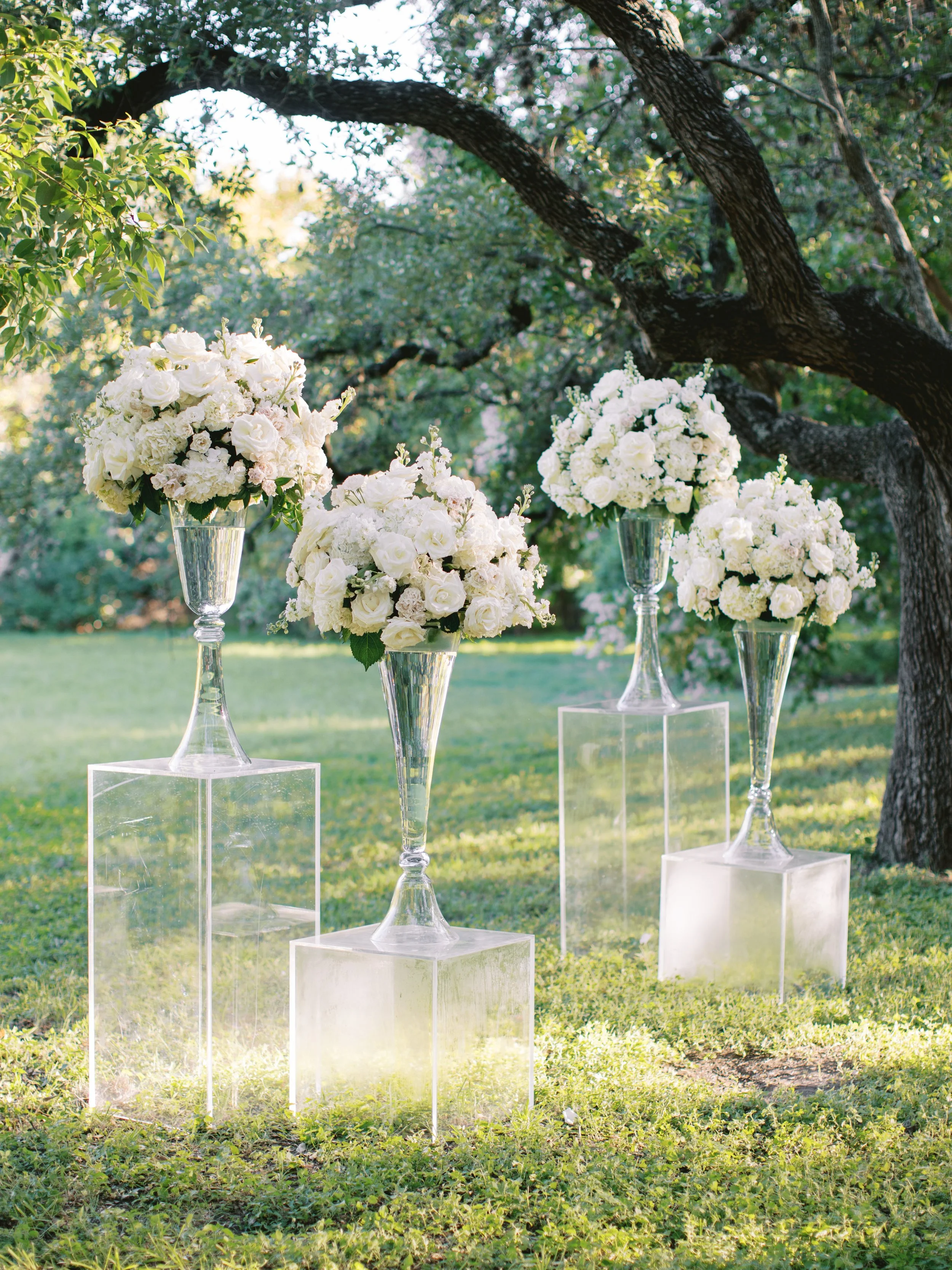 Elegant outdoor wedding decor with white floral arrangements in tall glass vases on clear acrylic pedestals, set in a lush garden under a large tree.