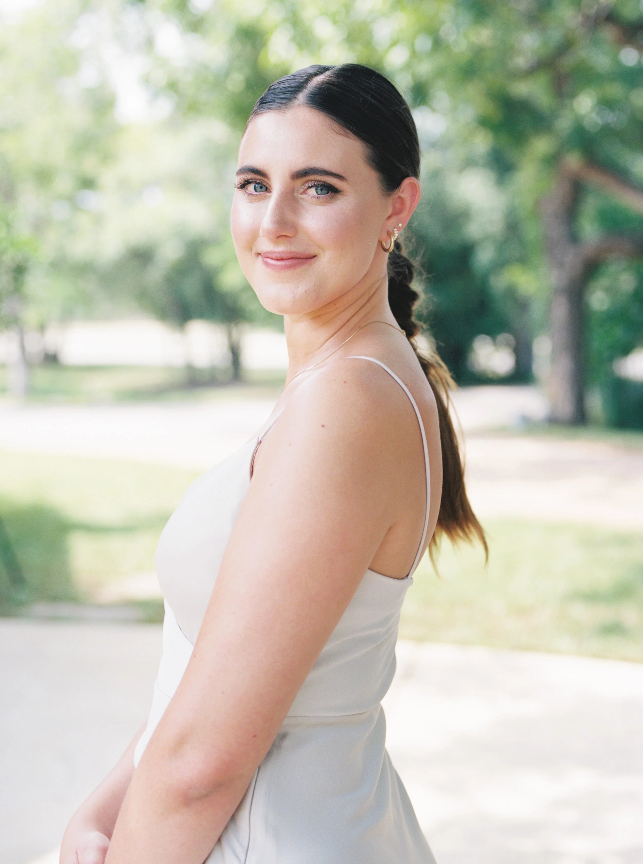 A young woman with dark hair tied back, wearing a white spaghetti strap dress, stands outdoors on a sunny day with green trees in the background. She is looking at the camera with a gentle smile.