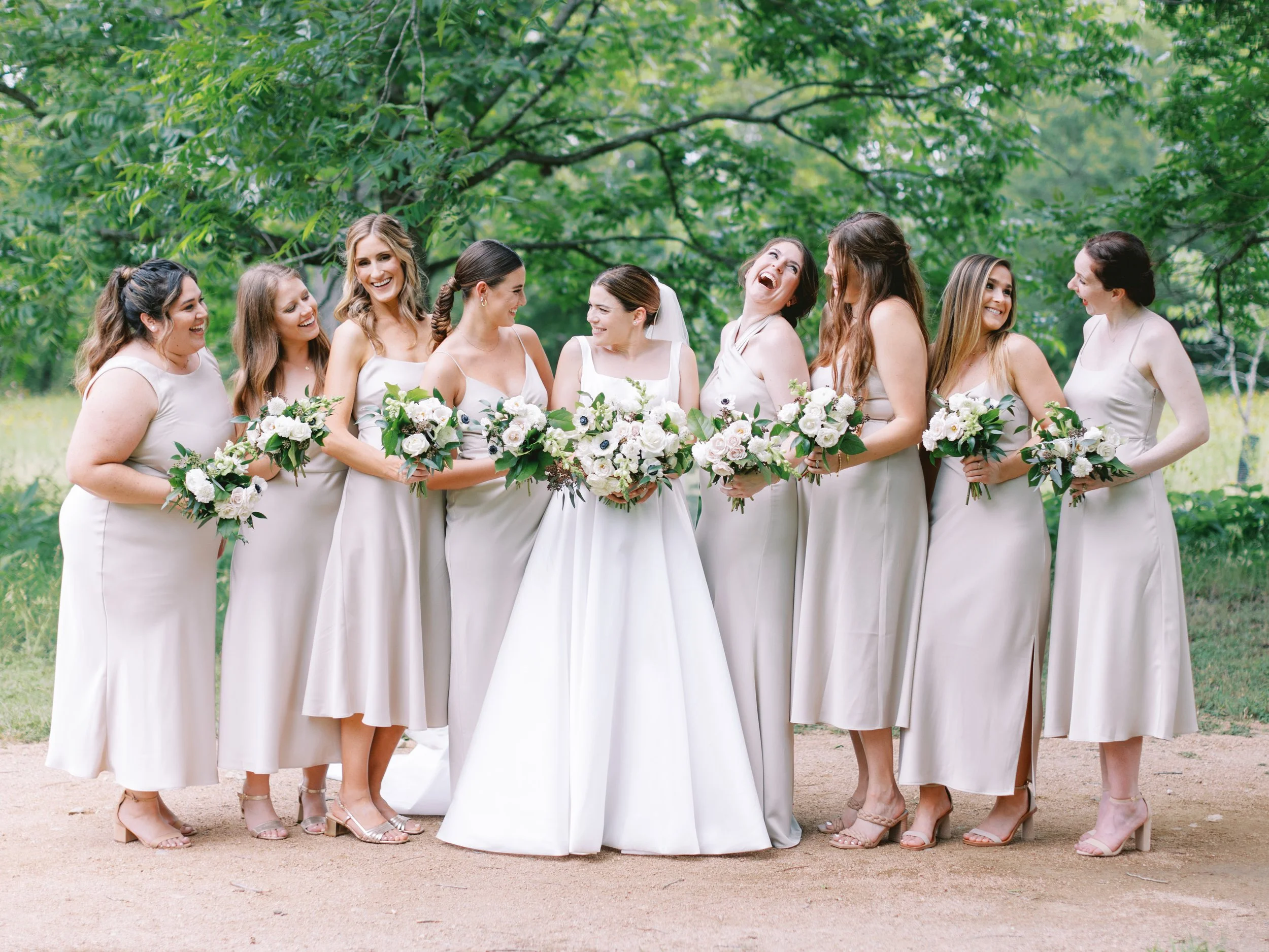 Group of seven women, including a bride in a white dress, standing outdoors under trees, holding bouquets of white and pastel flowers, all smiling and laughing.