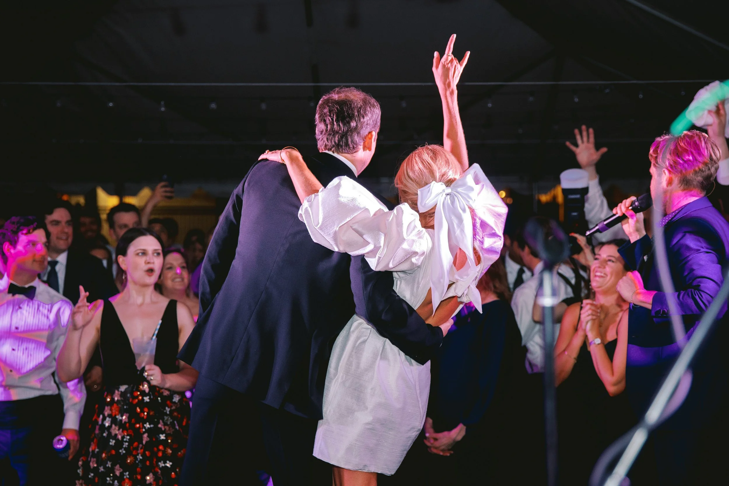 Couple dancing closely at a party or wedding reception, surrounded by people enjoying the moment. The woman is wearing a white dress with a large bow in her hair, and the man is in a black suit and tie. A woman on the right is singing into a micropho