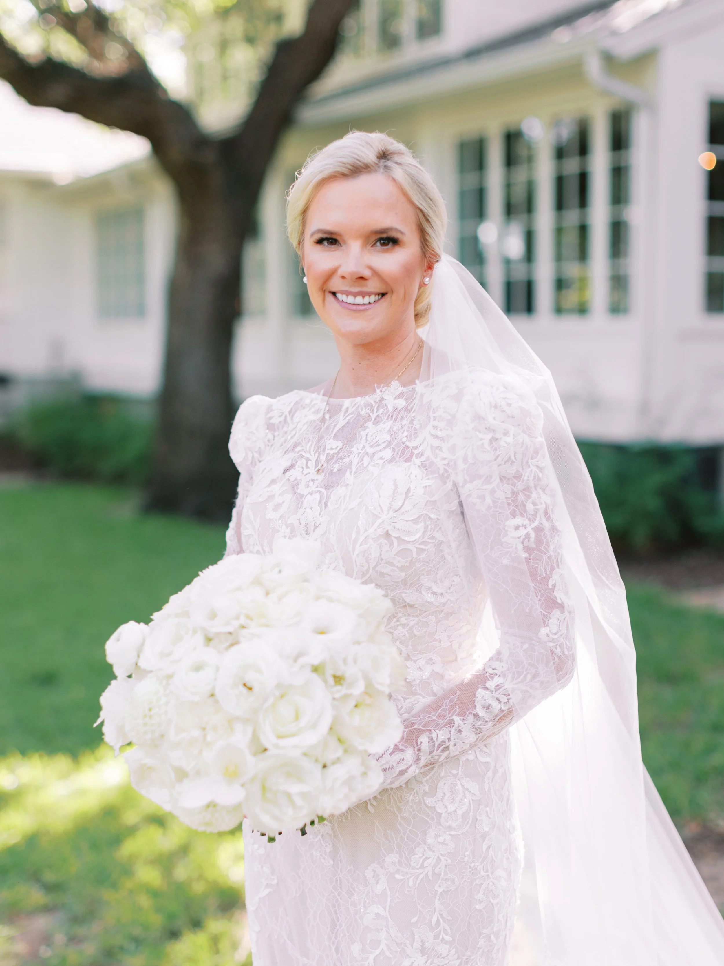 A smiling bride in a white lace wedding dress holding a bouquet of white roses outside near a house and tree.