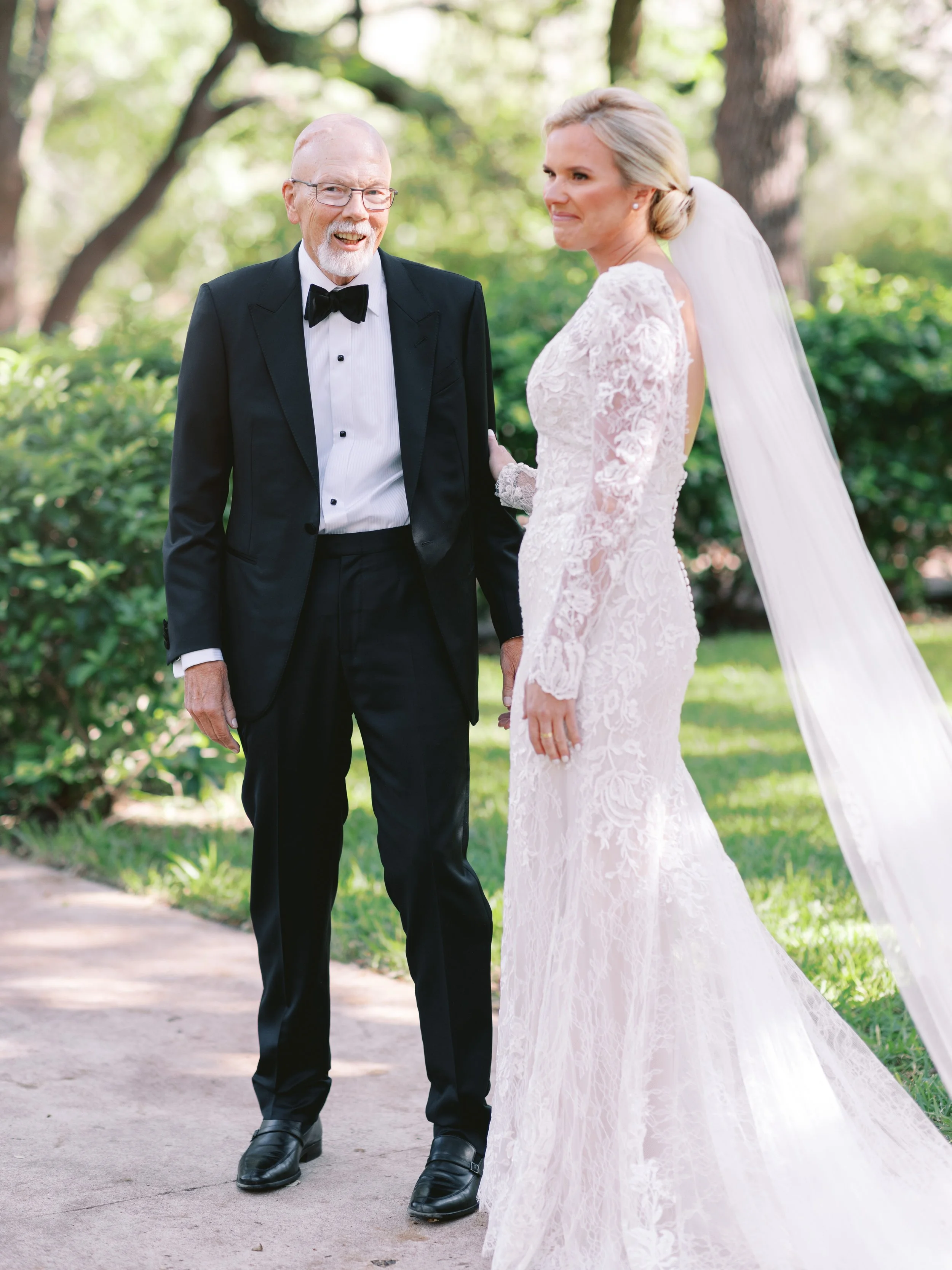 A bride in a white wedding dress walking with an older man in a black tuxedo outdoors.