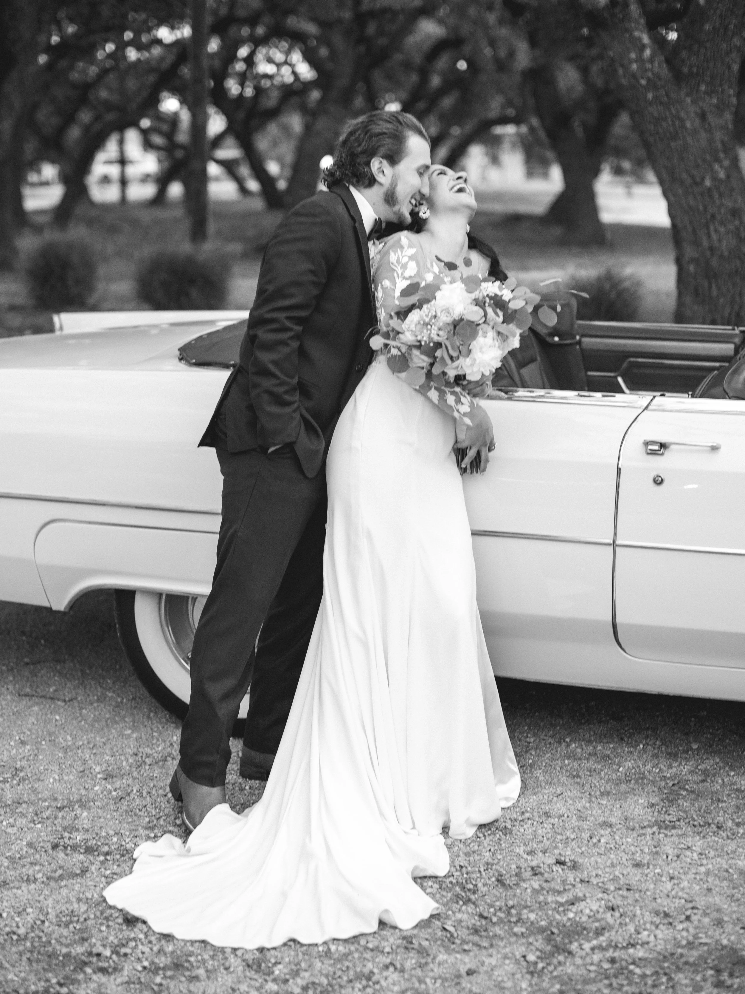 A newlywed couple sharing a joyful moment, leaning against a vintage convertible car in a park. The bride is in a white gown holding a bouquet, and the groom is in a tuxedo. They are laughing together.