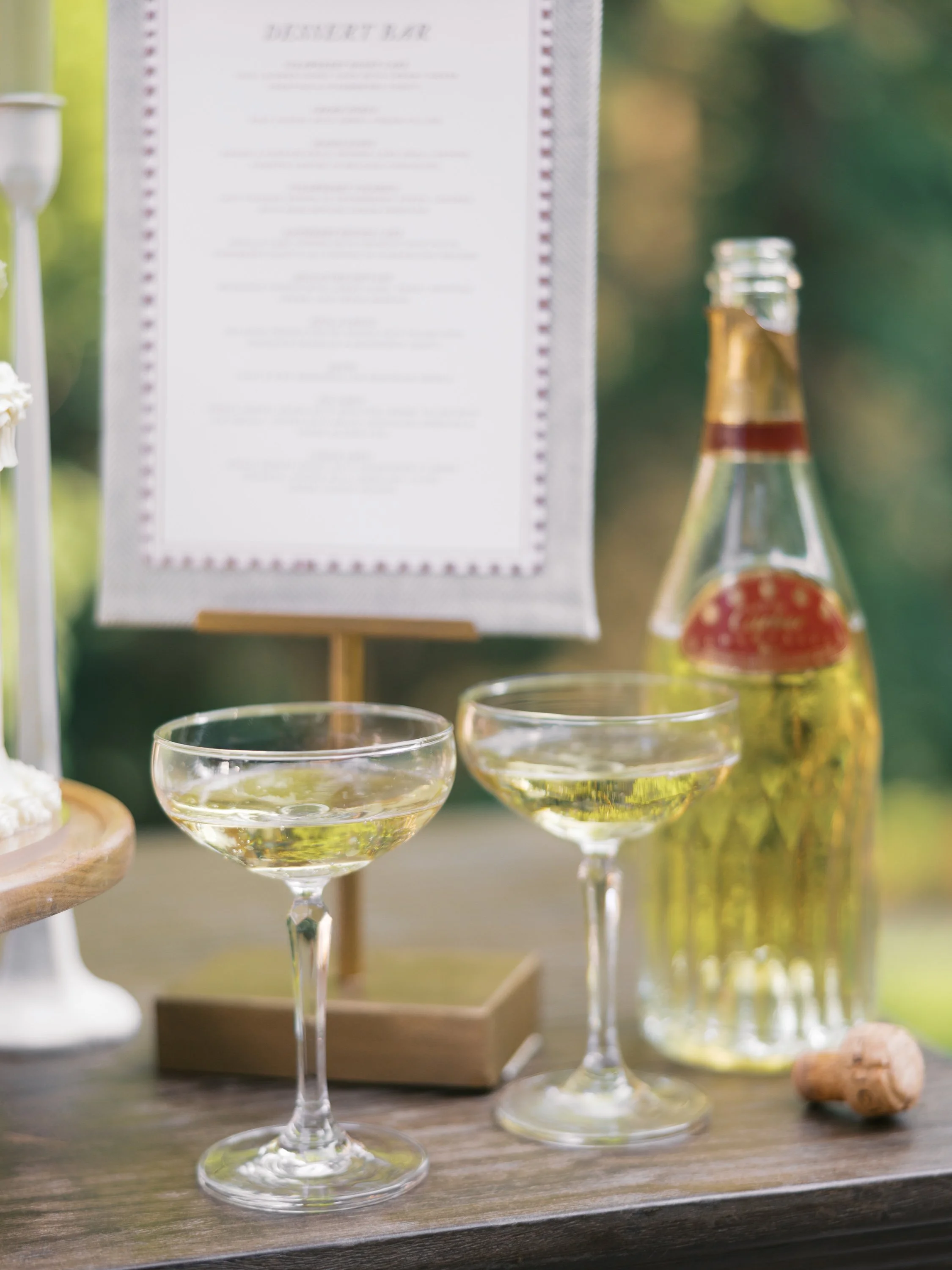 Two coupe glasses filled with champagne on a wooden table, with a bottle of champagne, a cork, and a blurred menu or sign in the background.