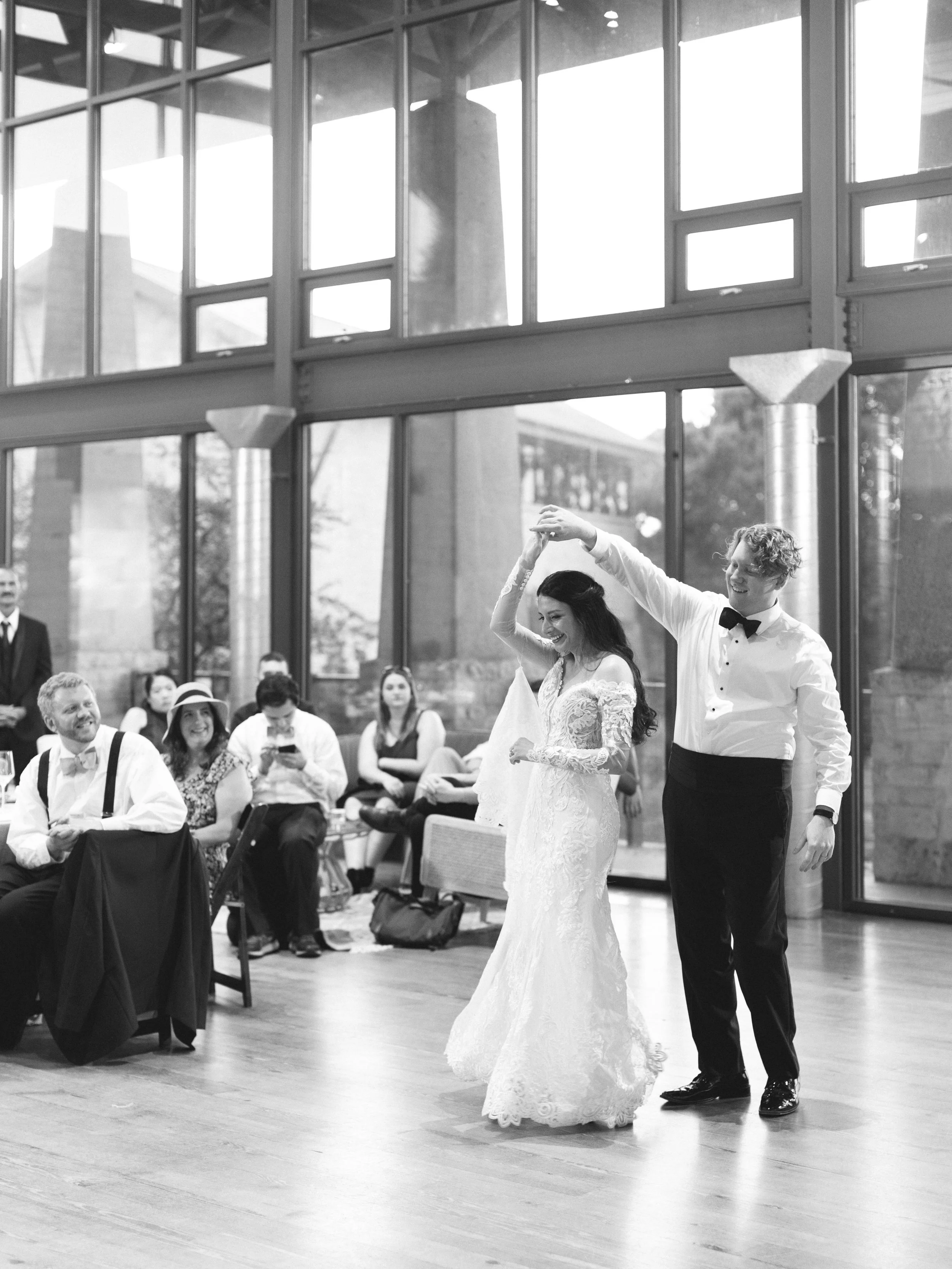 A black and white photo of a wedding dance, with the bride and groom twirling in front of seated guests, in a modern glass-walled venue.